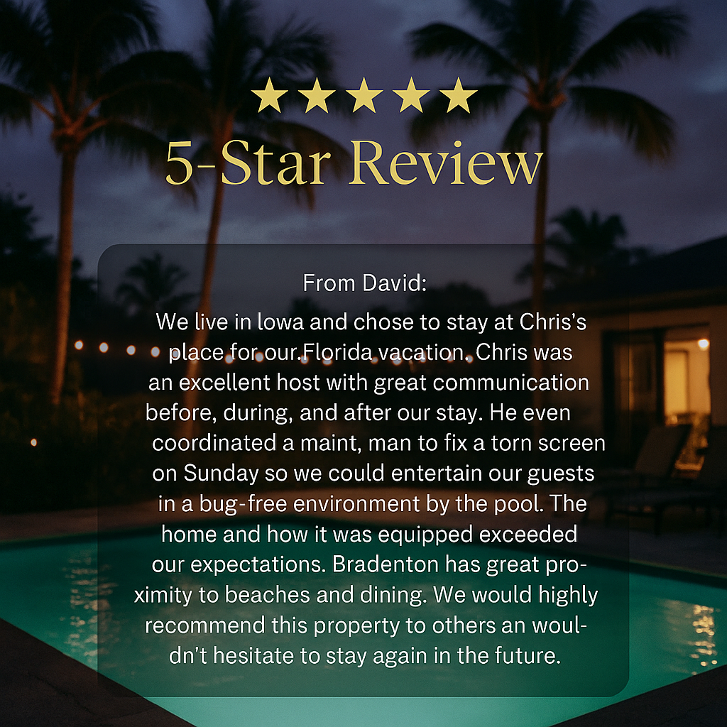 Hi, I'm Chris, a dedicated host with a passion for creating memorable vacation experiences! I love helping families and travelers discover the beauty of Bradenton and Anna Maria Island. With a focus on comfort, cleanliness, and attention to detail, I strive to make every stay at Beachin' Escape feel like a home away from home. Whether you're here to relax by the pool, explore the local beaches, or enjoy quality time with loved ones, I'm here to ensure your visit is unforgettable. I’m always just a message away if you need anything during your stay. Welcome to your perfect getaway! 🌴🏖️